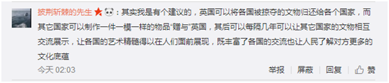 网友@披荆斩棘的先生:其实我是有个建议的,英国可以将各国被掠夺的文物归还给各个国家,而其它国家可以制作一件一模一样的物品“赠与”英国,其后可以每隔几年可以让其它国家的文物相互交流展示,让各国的艺术精髓得以在人们面前展现,既丰富了各国的交流也让人民了解对方更多的文化底蕴。