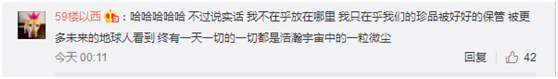 网友@59楼以西:哈哈哈哈哈 不过说实话 我不在乎放在哪里 我只在乎我们的珍品被好好的保管 被更多未来的地球人看到 终有一天一切的一切都是浩瀚宇宙中的一粒微尘
