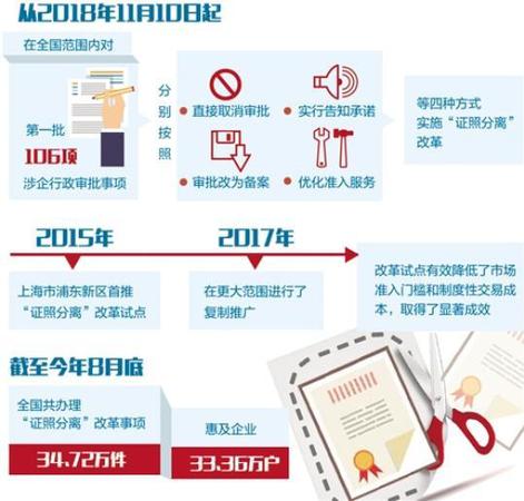 9月27日,国务院印发《关于在全国推开“证照分离”改革的通知》,明确要求从今年11月10日起,在全国对第一批106项涉企行政审批事项实行改革,推进“照后减证”。