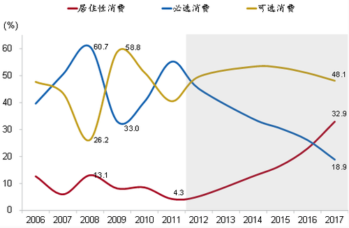 2011年以来,居住性边际消费支出的挤出效应非常明显:居住的边际消费支出占当年边际消费支出总额的比重逐年增长,且斜率愈发陡峭;居民必选消费的边际支出占比则大幅下降,可选消费的边际支出占比自2014年也呈下降趋势(图7)。如不改变国内房地产业与其他产业的畸形比例结构,预计居民的消费支出将继续倾向居住领域,未来其他领域的消费升级空间将依旧无法得到扩展。