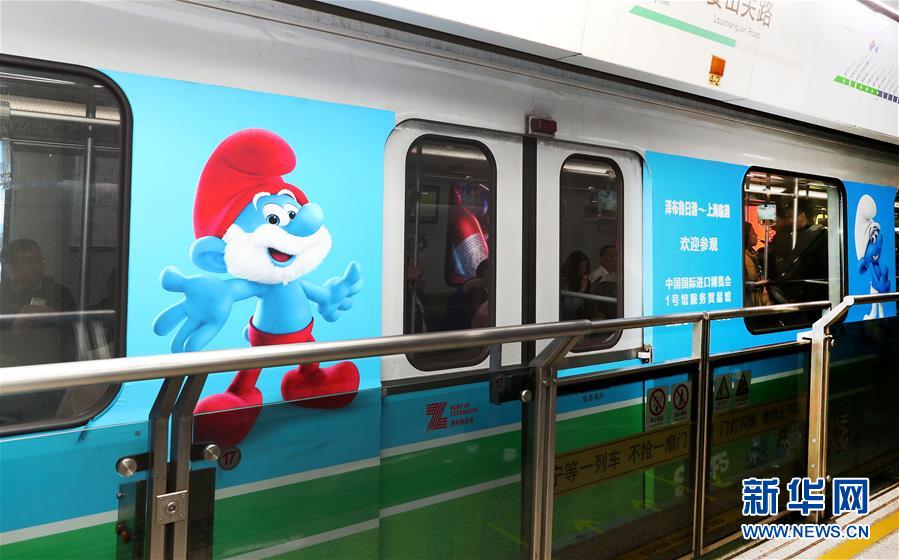 当日,一列中比主题地铁列车在上海地铁二号线首发。乘坐地铁前往进博会场馆国家会展中心(上海)的观众,将有机会搭乘到涂有比利时经典卡通形象蓝精灵的进博会主题列车。 新华社记者 方喆 摄