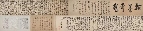 他对此卷祝允明草书《前赤壁赋》赞赏有加:“右枝山居士祝允明草书东坡《前赤壁赋》,乃其晚年所书真迹也?!艘嘧碇行撕ㄔ吮恃甘椋笥屑拿罾碛诤婪胖?,出新意于法度之中,真可谓一时之书,一时之妙也。”不愧是祝允明艺术最为成熟时期的狂草代表之作。