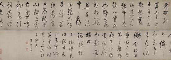 此卷草书《前赤壁赋》作于1524年,正是其归苏州第二年。正如苏子在赤壁赋中所言:“盖将自其变者而观之,则天地曾不能以一瞬;自其不变者而观之,则物与我皆无尽也,而又何羡乎”,此时祝氏早已褪去怀才不遇的压抑以及官场俗务的纷扰,而多了一份恣意潇洒、旷达不羁,艺术创作臻于高峰。