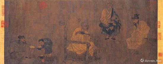《萧翼赚兰亭图》共有人物五位,一脸憨厚的老僧是辩才,对面坐的是面露狡黠的萧翼,上方盘坐的僧人看来颇为不悦,画幅左侧两名小厮正在煎茶?;斜尘俺士瞻?,画家藉人物与座椅的安排显示出空间的深度,这是唐代人物画的特色。
