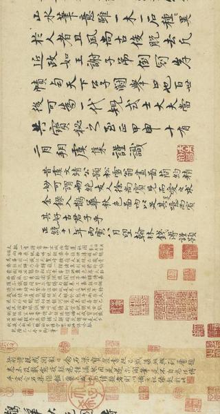 就印章、题跋来说,《鹊华秋色图》五米长的画卷,四米都是题跋。仅乾隆皇帝的印章就二十多个!可见其对《鹊华秋色图》的喜爱?!堆屿ヂ浴返墓适虏豢煽?,但此卷还真和乾隆皇帝有着“欢喜冤家”般的故事。乾隆十三年(1748),乾隆皇帝巡狩济南,闲暇里登上城门远眺,觉得这一带景色似曾相识,突然回想起这是《鹊华秋色图》中的景色,心中大喜。他连忙急命飞骑去京城禁中取来,对着鹊、华二山展卷对观,一番赞叹不绝之后,发现所画之景与现实中不相符,于是将此卷深藏内府,不复观。然而当他再次巡幸济南时,又一次想起了宫中的《鹊华秋色图》。面对美景,念及名画,他早已把上次的事忘得一干二净,于是下旨又一次派人回宫取画,且又在画上题写了“深情”的一跋。