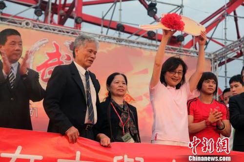 资料图:“平民英雄”陈树菊(左三)出席捐赠康复巴士仪式。中新社发 董会峰 摄