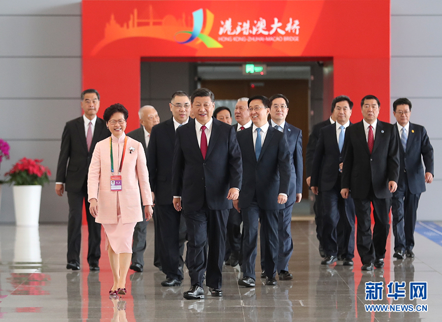 10月23日上午,港珠澳大桥开通仪式在广东省珠海市举行。中共中央总书记、国家主席、中央军委主席习近平出席仪式,宣布大桥正式开通并巡览大桥。这是习近平等步入仪式现场。 新华社记者谢环驰摄