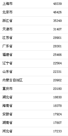 上海也是前三季度人均可支配收入突破4万元大关的仅有的两个地区之一,另一个是北京,为46426元。