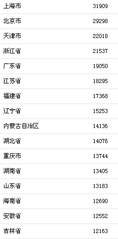 国家统计局公布的31省份居民人均可支配收入显示,上海、北京、浙江前三季度居民人均可支配收入排名前三。