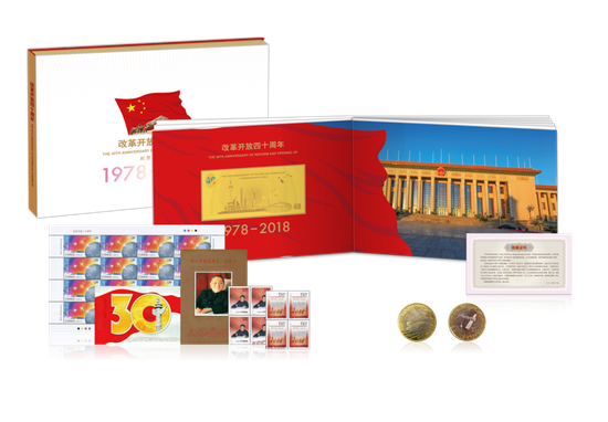 据了解,《改革开放四十周年》邮票珍藏册收录《邓小平同志诞生一百周年》纪念邮票小型张1枚,《中国共产党十一届三中全会二十周年》纪念邮票四方连1枚,《改革开放三十周年》纪念邮票整版票1版、小型张1枚,《改革开放四十周年》纪念邮票整版票1版、小型张1枚,《改革开放四十周年》首日封2枚;另收录0.1g《改革开放四十周年纪念金》1枚,中国航天普通纪念币、中国高铁普通纪念币各1枚。