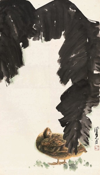 另外,在展览中,还可以看到笔精墨妙的大写意之作,如来楚生的《芭蕉鸭戏》、唐云的《桃花鱼鲜》;抑或构图以险绝取胜的兼工带写之图。如陈佩秋的《蕉阴栖禽》、程十发的《村童饲?!?。总之,展览之精、形式之多样、内容之丰富,使得展览精彩纷呈。