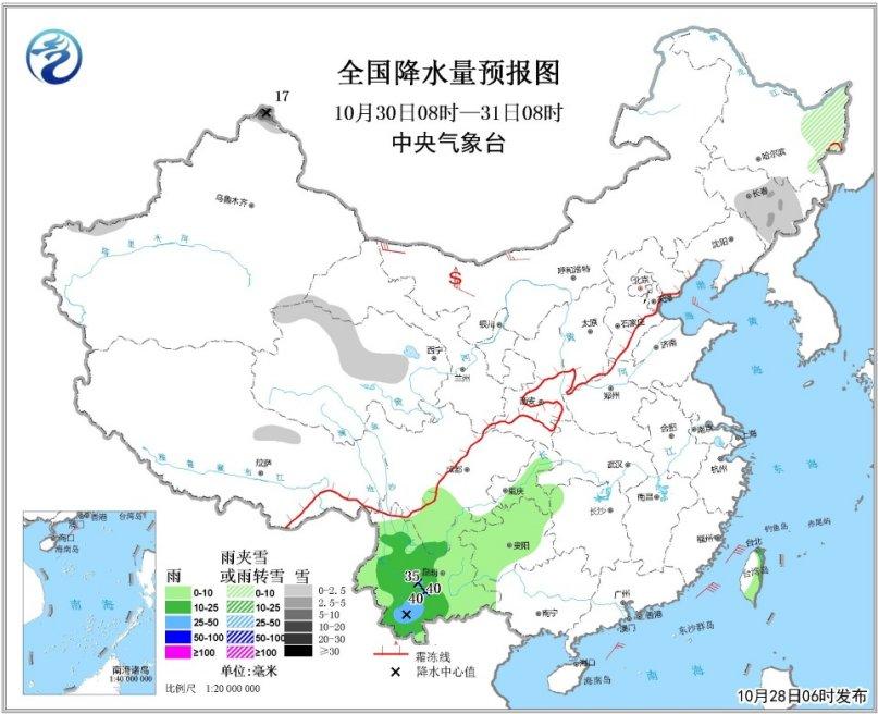 10月28日08时至29日08时,内蒙古中东部、东北地区、新疆北部、西藏中部等地有小到中雪或雨夹雪,新疆西北部高海拔地区、黑龙江西北部等地有大到暴雪。西南地区东部、云南等地有小到中雨,云南南部局地大雨。内蒙古中东部、东北地区西部、山东半岛、华北西部、黄淮西部、新疆西北部等地有4~7级及以上风。台湾以东洋面、巴士海峡将有6~8级、阵风9级的风,其中巴士海峡偏东海域的风力可达9~10级,阵风11级。