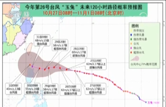 据中央气象台预计,“玉兔”目前基本向偏西方向移动,逐渐向巴士海峡靠近。30日,“玉兔”有可能继续西行进入南海,也有可能转向北上。从明天(29日)开始,受冷空气和台风共同影响,我国东部海区的风力会明显增大,东南沿海地区的人们要关注最新台风预报,及时做好防御措施。