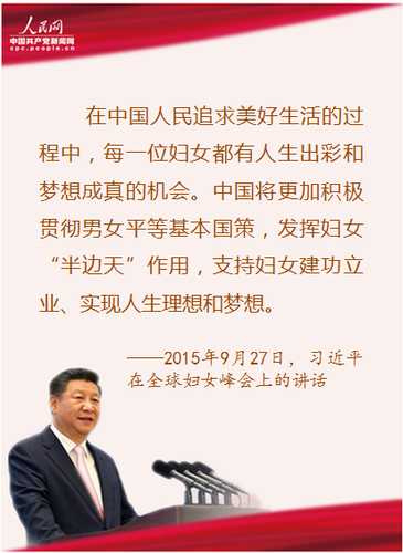 “中国将更加积极贯彻男女平等基本国策,发挥妇女‘半边天’作用,支持妇女建功立业、实现人生理想和梦想?!钡车氖舜笠岳?,以习近平同志为核心的党中央高度重视妇女事业,习近平总书记在不同场合多次强调发展妇女事业的重要意义,为妇女工作的开展指明了方向。