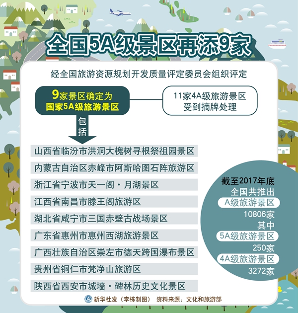 新华社北京10月30日电(记者胡浩)记者30日从文化和旅游部了解到,经全国旅游资源规划开发质量评定委员会组织评定,山西省临汾市洪洞大槐树寻根祭祖园景区等9家景区确定为国家5A级旅游景区,11家4A级旅游景区受到摘牌处理。