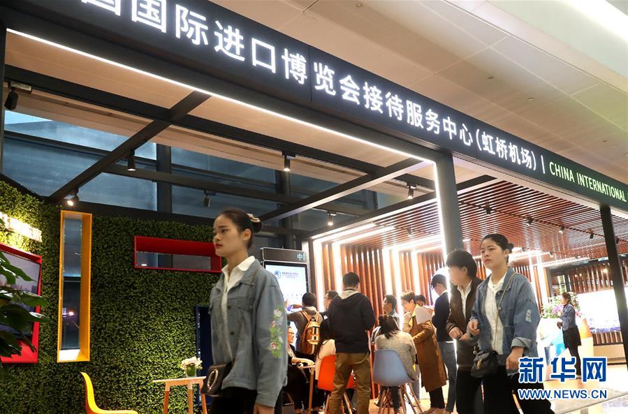 旅客从上海虹桥国际机场的中国国际进口博览会接待服务中心前走过(10月24日摄)。