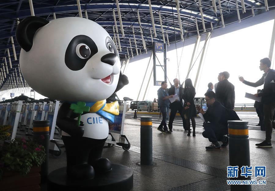 中国国际进口博览会吉祥物“进宝”在上海浦东国际机场的候机大厅入口处迎接四方嘉宾(10月25日摄)。 新华社记者 陈飞 摄