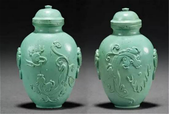 绿松石属优质玉材,中国清代称之为天国宝石,视为吉祥幸福的圣物。绿松石因所含元素的不同,颜色也有差异,氧化物中含铜时呈蓝色,含铁时呈绿色。其中以蓝色、深蓝色不透明或微透明,颜色均一,光泽柔和,无褐色铁线者质量最好。