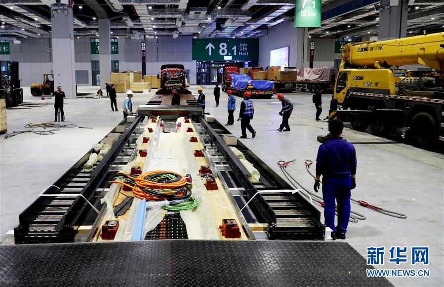 10月22日,“金牛座”龙门铣床床身(前)等待装运。 当日,来自德国的首届进口博览会最大展品——“金牛座”龙门铣床完成初步组装,将运往国家会展中心(上海)3号馆进行最后的安装施工。这是德国瓦德里希科堡公司研发的机床设备,高约8米,占地面积约200平方米,将在智能及高端装备区进行展出。 新华社记者方喆摄