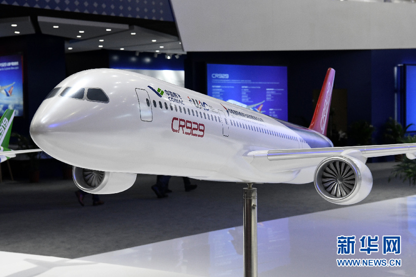 现场展示的CR929模型(11月7日摄)。 在第十二届中国国际航空航天博览会上,作为我国民用大飞机的研制主体,中国商用飞机有限责任公司展示了CR929远程宽体客机1:1样机,吸引了众多观众参观体验。 新华社记者 梁旭 摄