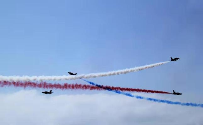 “红鹰”飞行表演队教-8机型在进行表演。新华网 崔凌云 摄