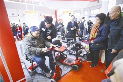 一位老年参观者在北京举行的养老产业博览会上体验老年代步车。陈晓根 摄/中新社