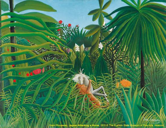 画出这幅画的卢梭曾受访表示:“我从来没去过比植物园的温室更远的地方旅行”。从来没离开过法国的他,却将《美洲豹正在袭击一匹马》发挥得淋漓尽致。如布景般的植物层层交叠,在画面中央制造出马与美洲豹的专属舞台。遭到凶猛美洲豹攻击的白马,面无表情地凝视着观众,细长的叶片有如生物触手般的摇曳着,令人感受到丰富的生命力,相较之下,动物们则仿佛停止在那决定性的瞬间。据说电影《马达加斯加》也深受卢梭画作的启发与影响。