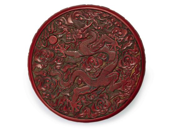 此剔红盖盒髹漆厚实,雕云龙威武奔腾,戏逐烈焰宝珠,纹饰立体灵妙,尽显明初御制雕漆工艺之卓绝造诣。此类永乐剔红漆盒,类同纹饰,并书年款者极为罕见,仅见寥寥鲜例,多贮于博物馆中。
