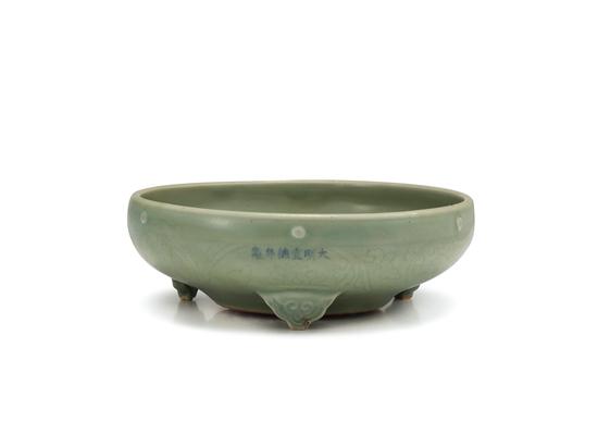 此类器型、釉色之宣德本朝带款碗例,寥若星辰。三足浅碗器型源自铜器,元末明初盛行,置于厅室或庙宇,作香器之用。