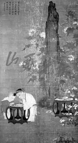 《秋庭戏婴图》的背景部分是,笋状的太湖石高高耸立,造型坚实挺拔,周围则簇拥着盛开的芙蓉花与雏菊,这样的布局,不仅冲淡了湖石的阳刚之气,也充分点出了秋天的节令。