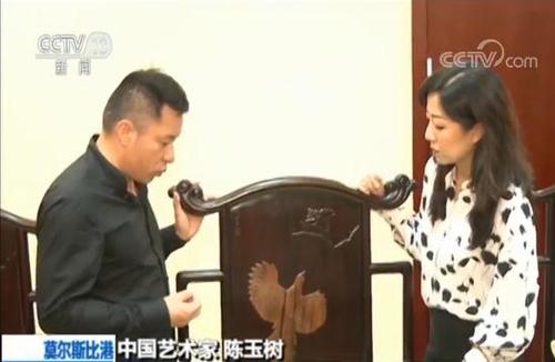 中国艺术家 陈玉树:我当时就想,我们如何在中巴新之间结合起来。我们有一些共同的人文的这种情怀,这个时候我就想到了利用巴布亚新几内亚的木头、珍贵的资源——胡桃木,还有巴布亚新几内亚的国鸟极乐鸟,作为一个题材来创作。因为我们选择了中国古典家具的座式,起源于唐宋,极乐鸟是在云中穿梭,相融合在一起。也希望在这次APEC上,用我们中国的精湛的千年传统的技艺,结合巴新的木头、巴新极乐鸟的素材,来展示中国的文化自信。