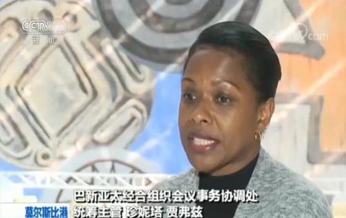巴新亚太经合组织会议事务协调处统筹主管 珍妮塔·贾弗兹:中国一直是巴布亚新几内亚伟大的朋友,因为给巴新带来了很多发展(机会)。今天我们坐下看看,变化是巨大的。如果要单说的话那么首先是道路的修建,还有建筑,如国际会议中心。而且中国给巴新带来了出口的机会,还有对当地教育所做的贡献,两国的合作让巴新获得了很大发展,让巴新获益很多。