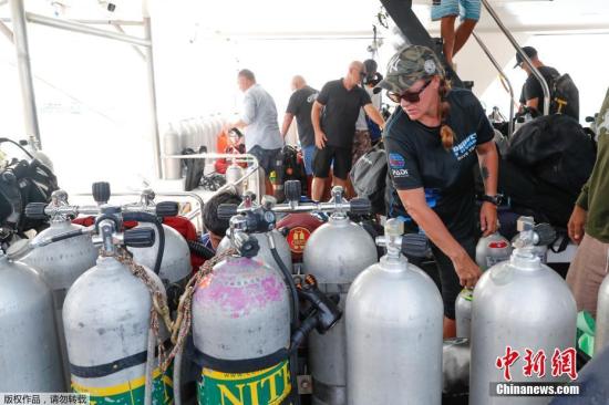 当地时间2018年7月7日,泰国吉岛海域附近,潜水员检查船上的氧气罐,准备进行搜救工作