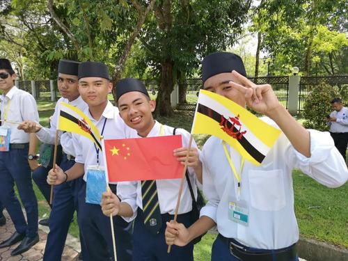 △文莱欢迎仪式现场的一群男孩。(央视记者臧青拍摄)