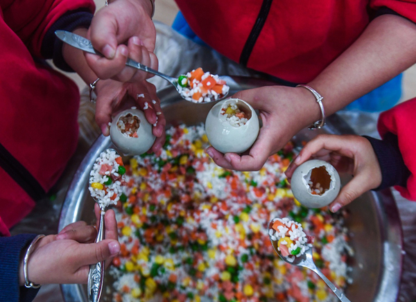11月21日,孩子们用糯米、蔬菜、咸鸭蛋制作糯米咸蛋。