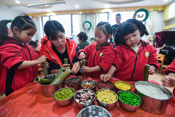在小雪节气即将到来前,浙江省长兴县李家巷镇中心幼儿园的孩子们在老师的带领下,用大米、糯米、玉米、南瓜、赤豆、咸鸭蛋等农产品亲手制作竹筒饭、八宝糕、糯米团、糖葫芦等,让孩子们在制作传统美食的过程中了解节气文化,在欢乐的气氛中迎接小雪节气的到来。