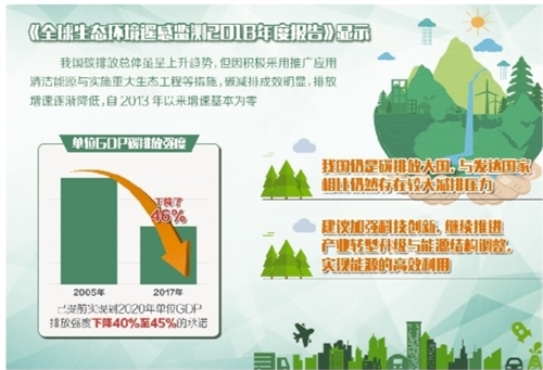 报告显示,我国碳排放总体虽呈上升趋势,但因积极采用了推广应用清洁能源与实施重大生态工程等措施,碳减排成效明显,排放增速逐渐降低,自2013年以来增速基本为零。2017年单位GDP碳排放强度比2005年下降了46%,已提前实现到2020年单位GDP排放强度下降40%至45%的承诺。