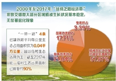 报告还分析了“一带一路”互联互通重大工程对环境的影响。报告指出,被监测的4条已建铁路均采用了绿色施工方法,有效降低了工程的永久生态占用量,并加快了施工期间临时生态占用的恢复。4条铁路平均每公里的生态占用面积仅为0.04平方公里,且以临时生态占用为主,截至2017年底,临时生态占用面积已修复约90%;已建和在建的8条道路设计了大型动物?;ねǖ?5处、桥涵洞3829个、隧道110处,有效保障了野生动物的自由迁徙和生态廊道的联通。报告建议,未建工程项目应进一步优化选线,注意生态环境?;ぃ】赡鼙芸叵叩淖匀槐;さ?。(经济日报·中国经济网记者 佘惠敏)