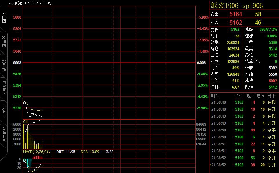 中新经纬客户端11月27日电 27日,纸浆期货在上海期货交易所挂牌,上市首日六个品种全线跌停。夜盘开盘后,纸浆期货延续跌势,1907、1908等多个合约跌停,截至发稿时,主力合约1906合约跌超7%,报5226元/吨。