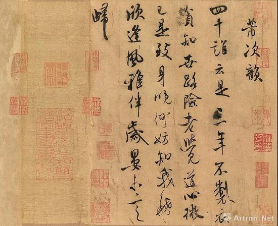 在画的旁边,有同时代非常著名的书法家米芾的作品。米芾书法作品的不同之处在于细线的走若游丝,重的部分又重如磐石。目前,我们只能找到当时宋代四大家苏、黄的合璧,也就是《寒食帖》,现藏台北故宫。这件“苏米合璧”,相信在历史上应该很难再找到第二件。