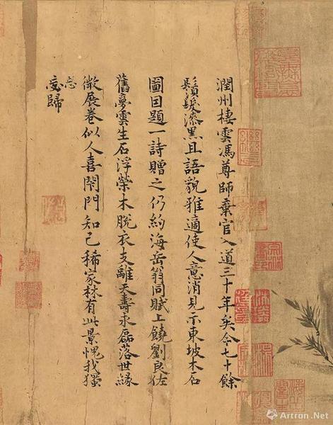 刘良佐题跋 [润州栖云冯尊师,弃官入道,三十年矣!今七十余,须发添黑,且语貌雅适,使人意消。 见示东坡木石图,因题一诗赠之, 仍约海岳翁同赋,上饶刘良佐。 旧梦云生石,浮荣木脱衣。支离天寿永,磊落世缘微。 展卷似人喜,闭门知己稀。家林有此景,愧我独忘归。]