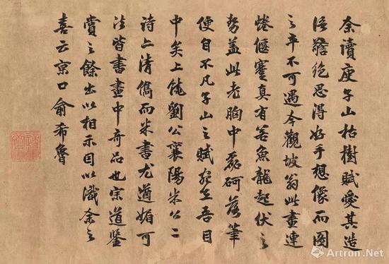 俞希鲁题跋 [余读庚子山枯树赋,爱其造语警绝,思得好手想像而图之,卒不可遇。今观坡翁此画,连蜷偃蹇,真有若鱼龙起伏之势,盖此老胸中磊砢,落笔便自不凡。子山之赋,苑在吾目中矣!上饶刘公,襄阳米公,二诗亦清儁,而米书尤遵媚可法,皆书画中奇品也!宗道鉴赏之馀,书以相示,因以识余之喜云。京口俞希鲁。]