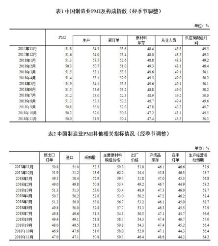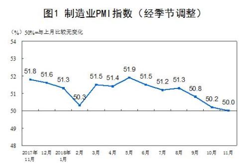 中新网11月30日电 据国家统计局网站消息,统计局今日公布2018年11月中国采购经理指数运行情况:2018年11月份,中国制造业采购经理指数(PMI)为50.0%,比上月小幅回落0.2个百分点,处于临界点。