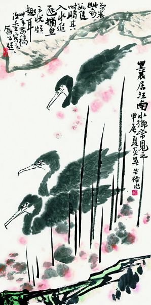 观看此图,最好站在十米开外,才能充分感受到作品的气势。这气势不仅源于它的体量,来自于精心的布局,更来自于饱满的气韵。李苦禅自传统中走来,其命维新,在长方形的稳定中求险求奇。首先请看荷塘中石块的安排。最下方一带露出巨石的上部边缘,有溪涧倾泻而过。茂盛的荷花掩映其后。左侧一块方中有圆的巨石成为视觉中心点,周围铺满了荷叶与荷花。三只鹭鸶,站立石上,有昂首,有俯身,有扭转,姿态写真,给画面注入新的生趣。其中两只将我们的视线引向远处,那里有汩汩溪泉,泠泠作响,右上方一块巨石横亘而出,不仅呼应了画面最下边的岩岸,又给人一种出其不意的心理感受??囔壬簧白?,钟情于碑体,行草中不乏隶书之笔意。由此可悟,这一块突兀横生的巨石,犹如隶书中最重要的横笔,力度沉雄,气质古厚。石壁之上题跋抒情,恰得其所。巨岩正下方不远处有尖头坡岸作陪衬,极大深化了画面的空间层次感。荷叶蔓溯其间,劲拔生长,与几块巨岩的横向贯通之势形成了鲜明的对抗态势。这样,画面中既有横线,又有纵线,纵横交错,满塘生辉。从中国传统道家文化上讲,石为阳,荷为阴,一“硬”一“软”,使画中气脉流转,生命气象令人怦然心动。整幅作品横纵多姿,尤以横向开阔为主,不断将观者视线引向画外更广阔处。设色古雅,赭石与墨色交相辉映,朵朵红荷点缀其间,不由让人想到“接天莲叶无穷碧,映日荷花别样红”的景象。