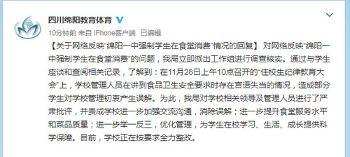 绵阳官方回应“强制学生食堂消费”:校方言语失当