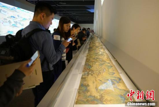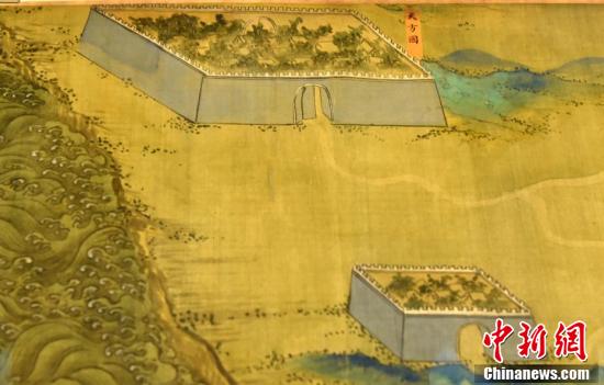 12月6日,“丝路山水地图展”在香港科学馆开幕?!端柯飞剿赝肌肥怯擅鞒⒒嬷频牡赝?,长约30米、宽0.6米,该地图东起嘉峪关,西达天方国(沙特阿拉伯麦加),反映明朝时代丝绸之路的面貌。这幅地图一度流落海外,香港企业家许荣茂购得该地图后捐赠予故宫博物院。图为《丝路山水地图》局部:嘉峪关。