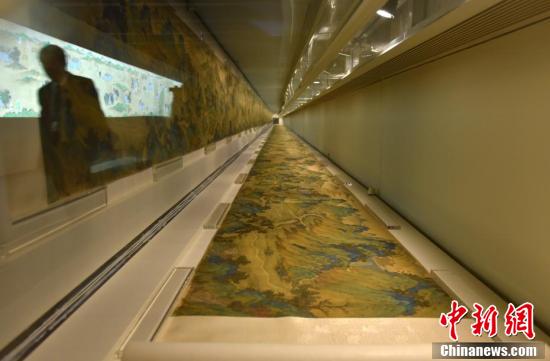 图为 《丝路山水地图》真迹(左)与运用现代影像技术动态展示的《丝路山水地图》(右)一起展示。