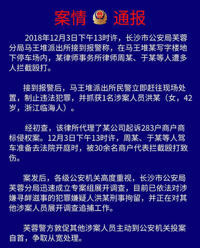 上述通报称,2018年12月3日下午13时许,长沙市公安局芙蓉分局马王堆派出所接到报警称,在马王堆某写字楼地下停车场内,某律师事务所律师周某、于某等人遭多人拦截殴打。接到报警后,马王堆派出所民警立即赶往现场处置,制止违法犯罪,并抓获1名涉案人员洪某(女,42岁,浙江临海人)。
