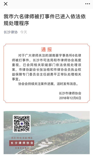 6日,长沙市律协通过微信公众号“长沙律协”表示,对于广大律师关注的湖南豪宇事务所6名律师被打事件,长沙市司法局和市律师协会高度重视,已会同相关职能部门依法依规处理该案,市律协副会长张治梧和市律协会员执业权益保障专门委员会主任胡勇平正带队处理相关事宜。协会会持续关注案件进展,适时发布消息。