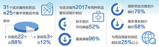 拟中选结果显示,31个试点通用名药品有25个集中采购拟中选,成功率81%。其中,通过一致性评价的仿制药22个,占88%,原研药3个,占12%。与试点城市去年同种药品最低采购价相比,拟中选价平均降幅52%,最高降幅96%。原研药吉非替尼片降价76%,福辛普利钠片降价68%,与周边国家和地区相比低25%以上。